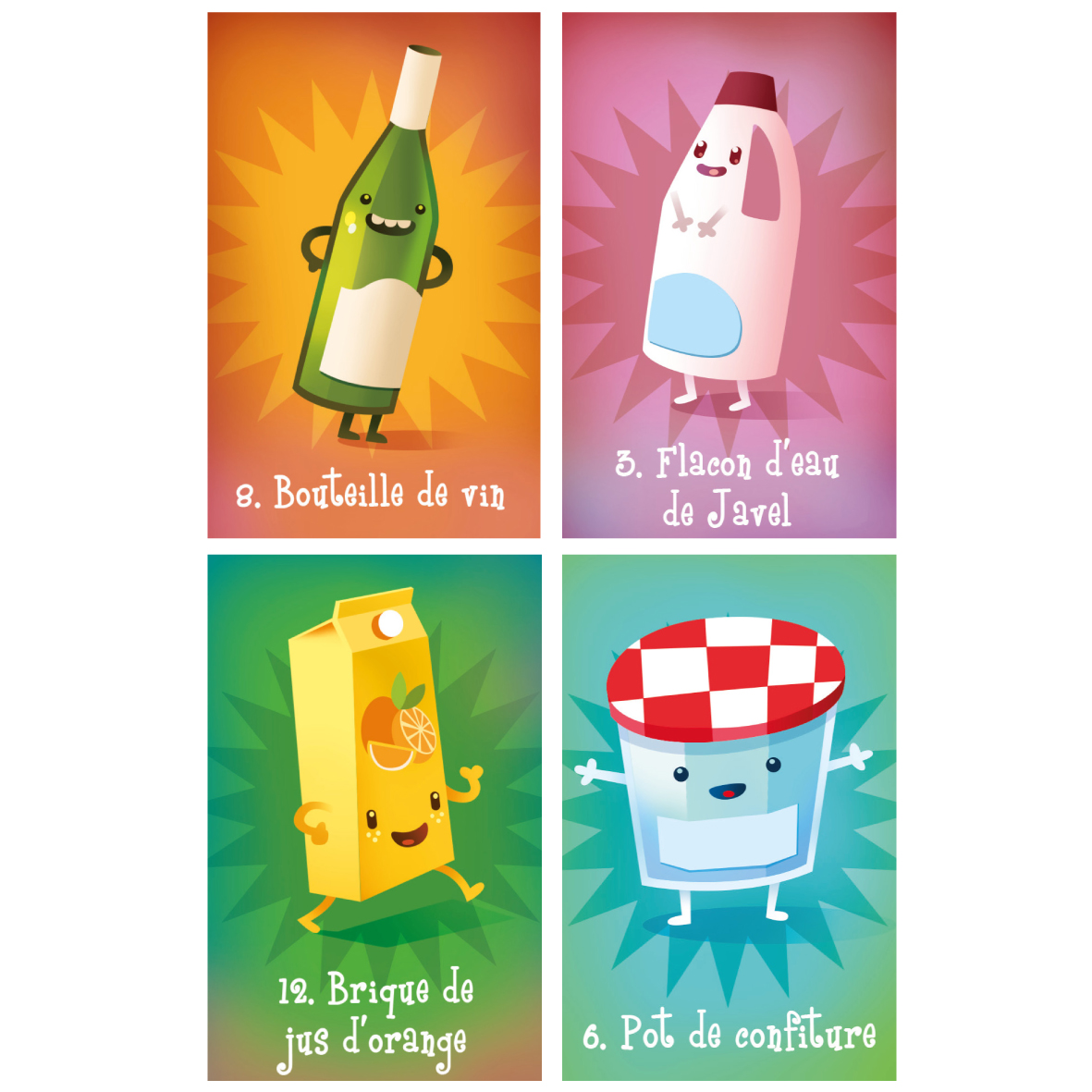Illustrations réalisées pour des projets de jeux au sein de la société Abeilles. Le premier jeu est un mémo sur les fruits et légumes, le second est un jeu de cartes qui traite du recyclage.